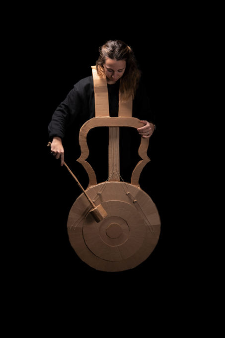 scale model, as creative as possible. It should be also accurately modeled with many details. I had about two weeks to assemble the model of the instrument, that I called „Gongcello“. For the shape of the upper part I took inspiration from the electric cello, that can have little or no body at all because it relies on electronic amplification (rather than acoustic resonance). The Gongcello is equipped with two shoulder-shaped rods in order to integrate the instrument with the musician. My imaginary instrument can be played through a hammer that is combined with a bow.
